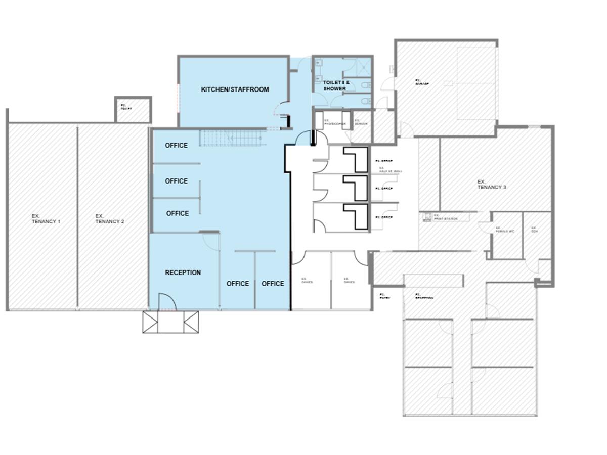■ Reception area, 5 glass partitioned offices, boardroom, kitchen/staffroom and internal toilets